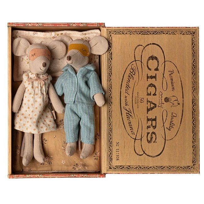 Mama en papa-muizen dragen hun prachtige nachtkleding en oogmaskers.