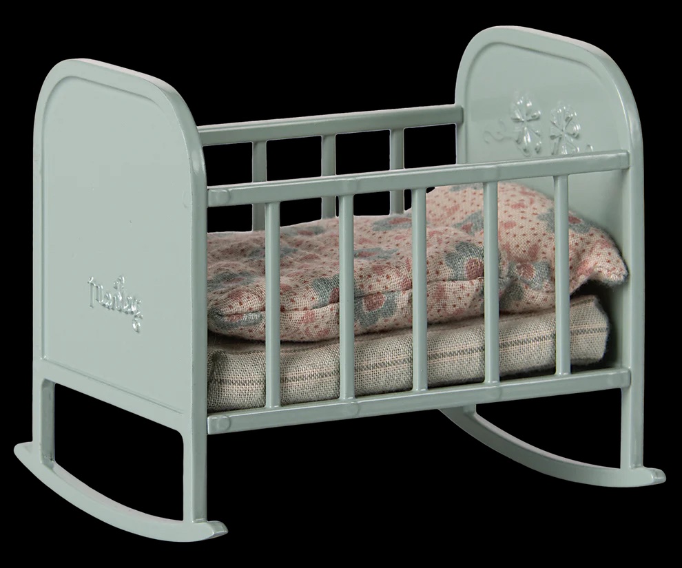 Het poppenwiegje met mintkleur is ideaal voor de babymuisjes van de muizenfamilie maar ook een klein babykonijntje of varkentje kan hier heerlijk in slapen.
