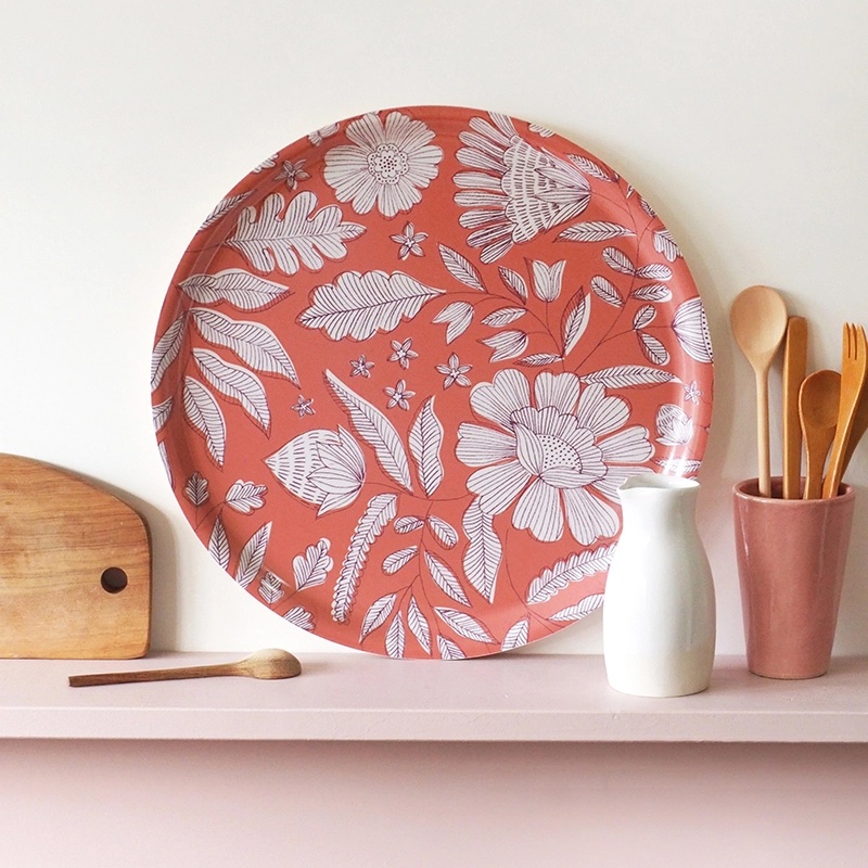 Het plateau wordt met de hand gemaakt in Zweden, afkomstig van berkenhout uit Scandinavische bossen en FSC-gecertificeerd. Een laag melamine maakt het oppervlak hittebestendig tot 130°C.