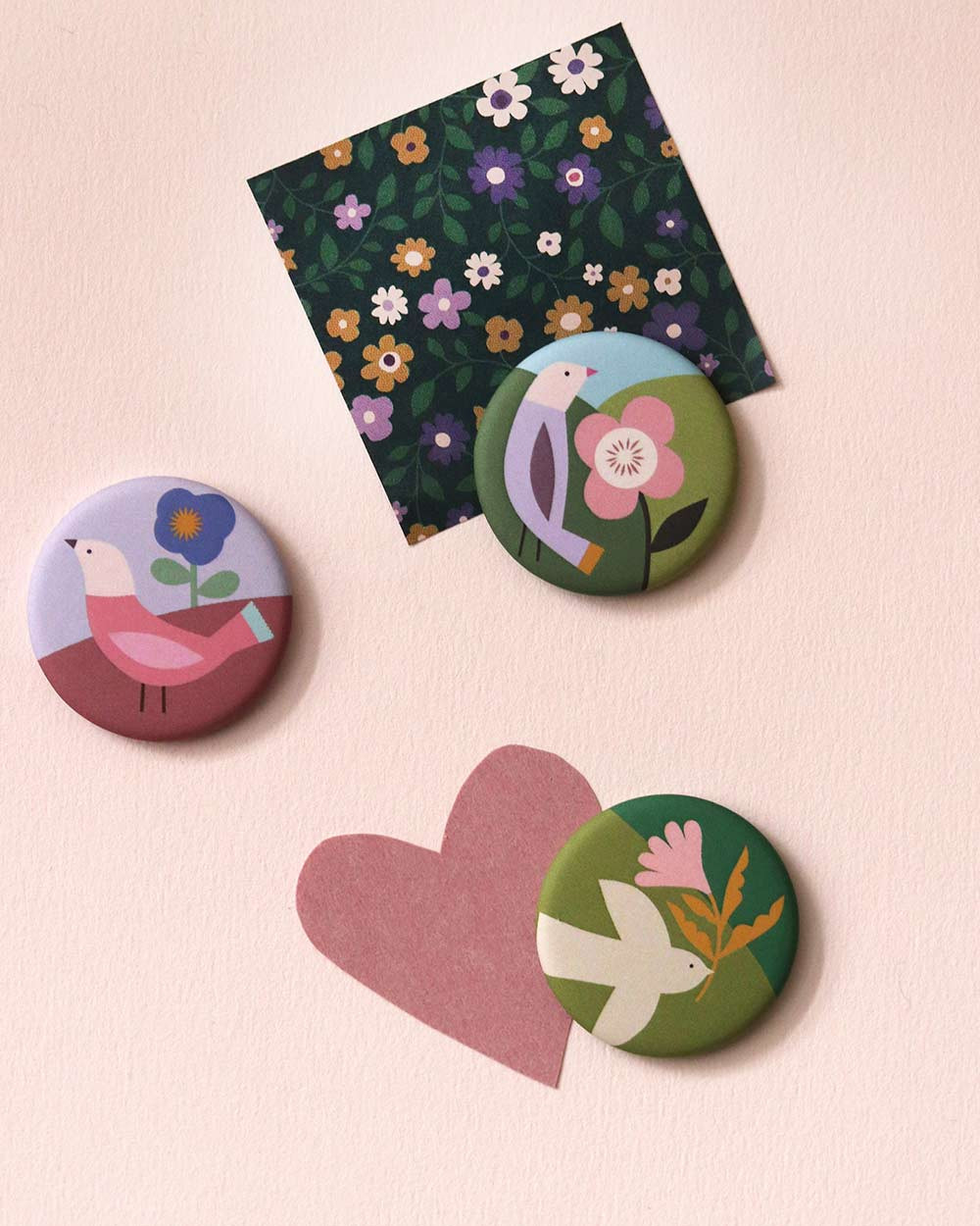 Een set fleurige magneten met vogelprint.