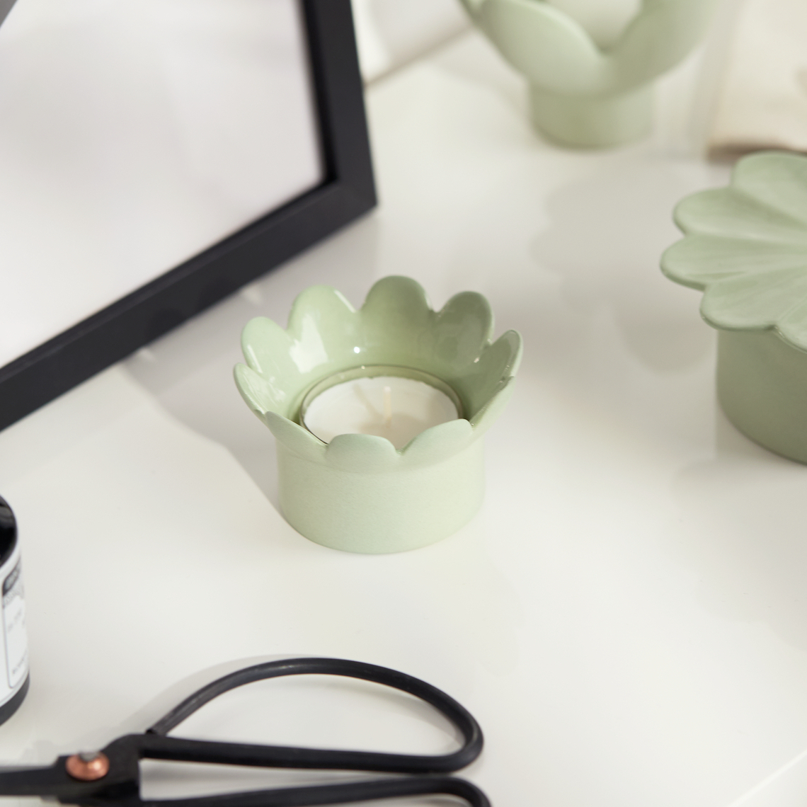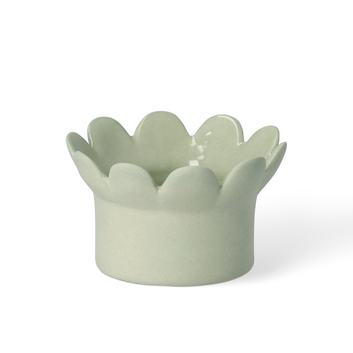 Theelichthouder van het Duitse merk Räder: groene bloemvorm. Steengoed, binnenin geglazuurd.