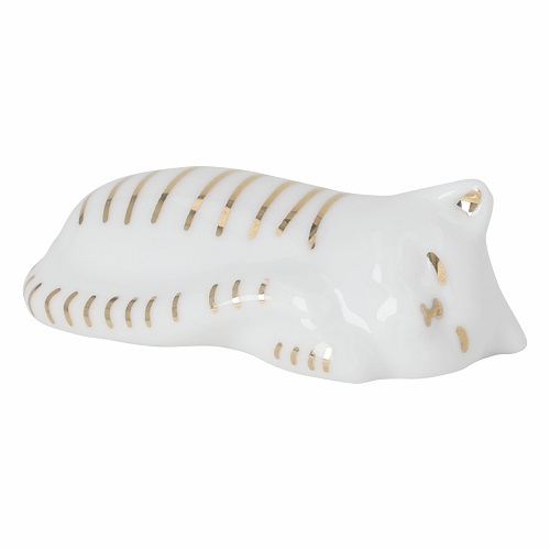 De kat is gemaakt van wit porselein en met goudverf afgewerkt.
